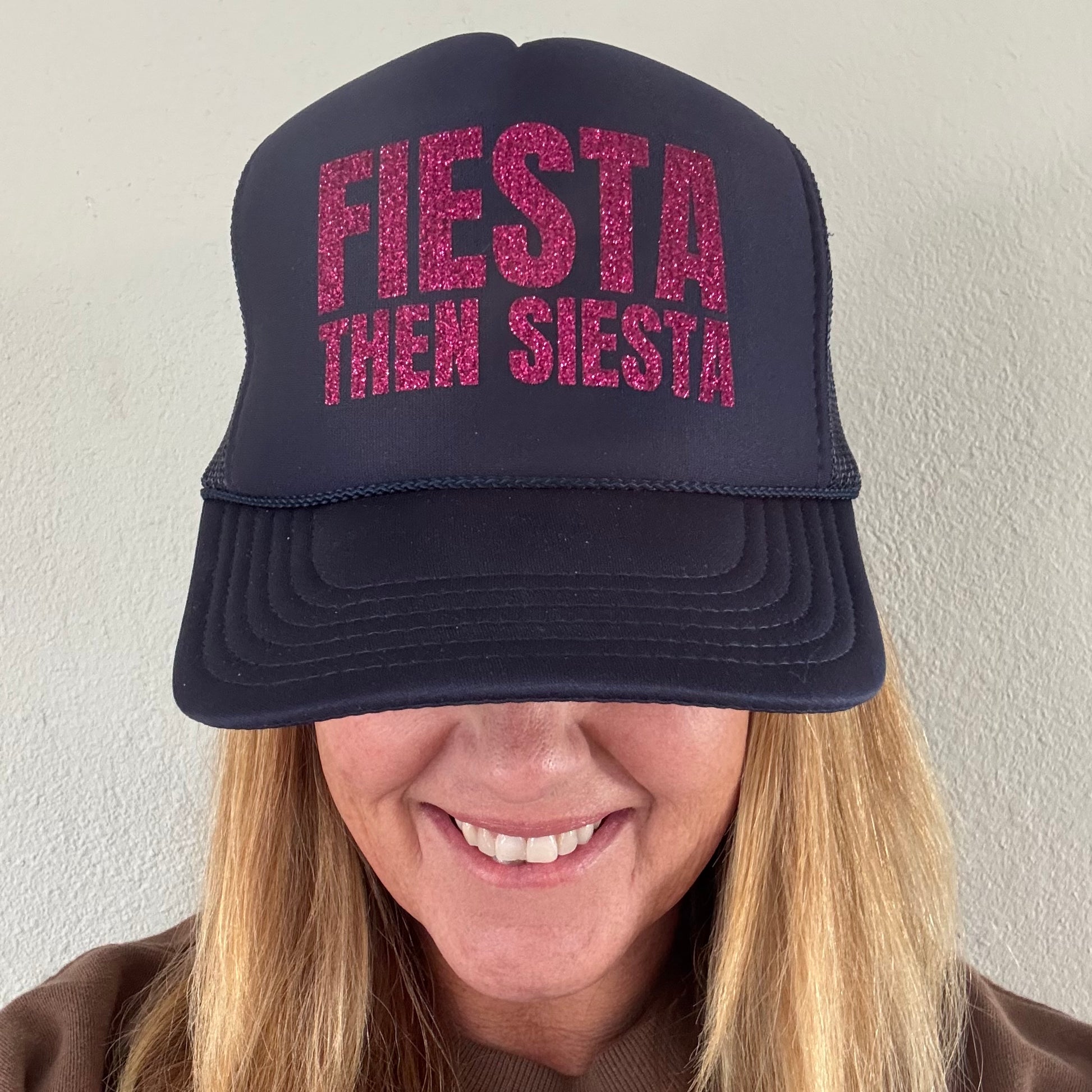 Fiesta then Siesta in hot pink sparkle on a navy trucker hat. Interior french terry sweat band and adjustable snap back.