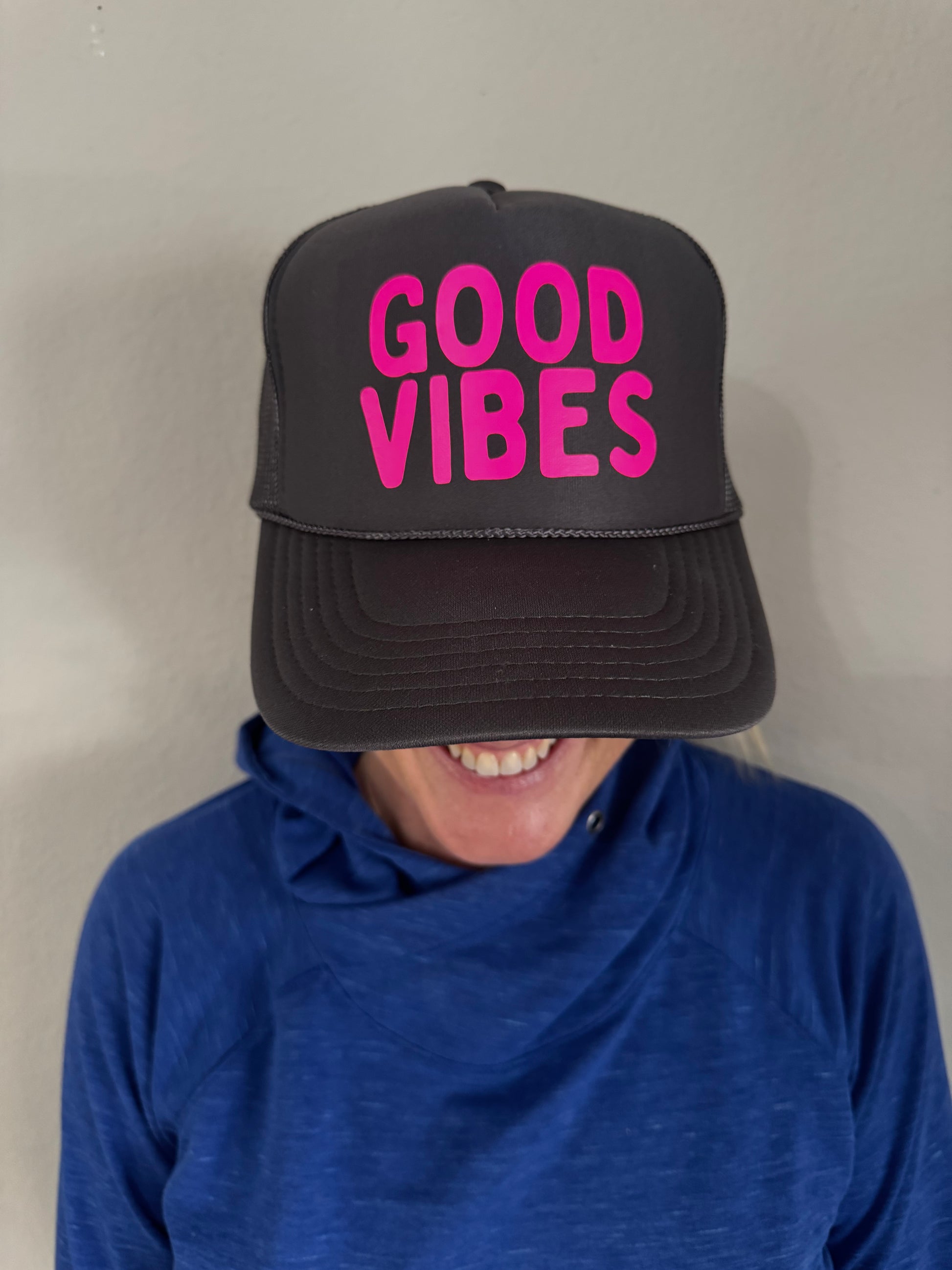 GOOD VIBES in neon pink on a charcoal trucker. Interior french terry sweatband and adjustable snap back.