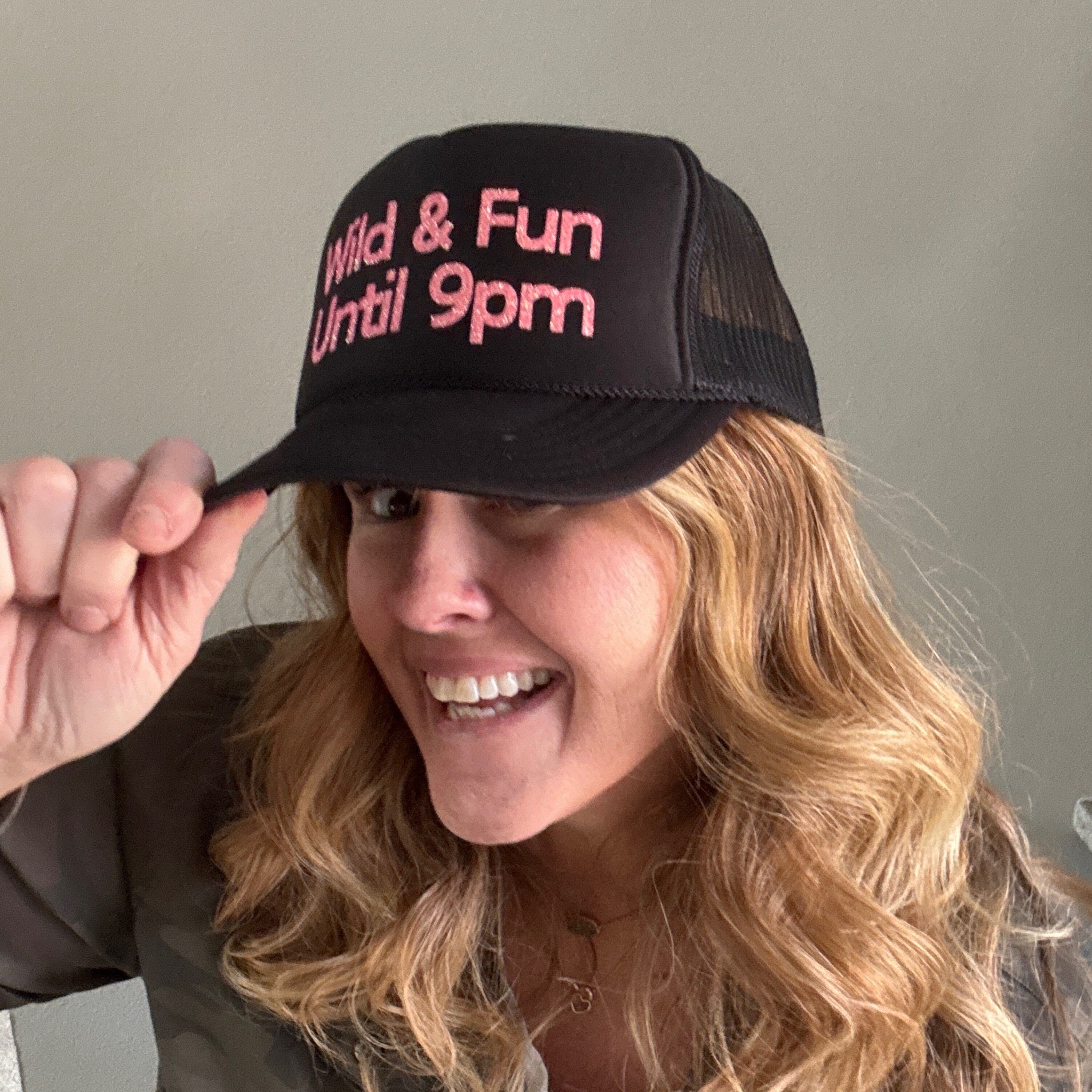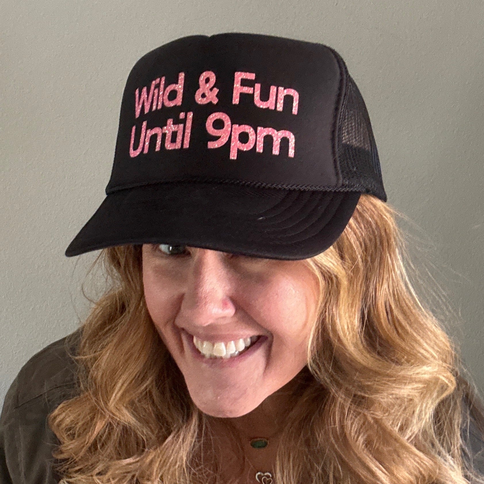 WILD + FUN UNTIL 9PM in neon coral sparkle on a black trucker hat. Interior french terry sweat band and adjustable snap back.
